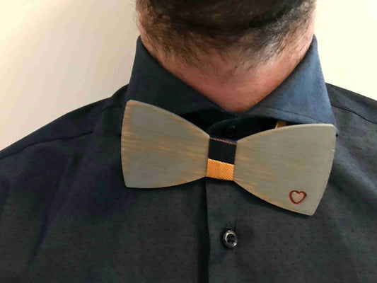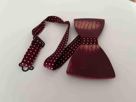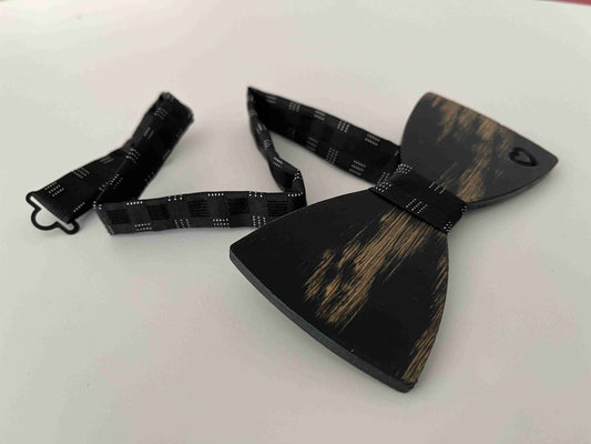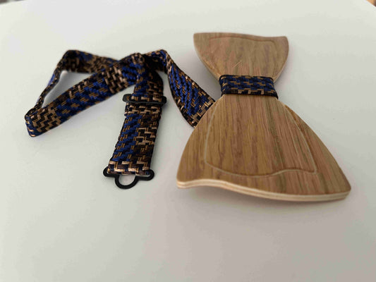 La nostra linea di papillon in legno rovere naturale o verniciato effetto invecchiato, con cinturino in stoffa regolabile per ogni misura di collo.